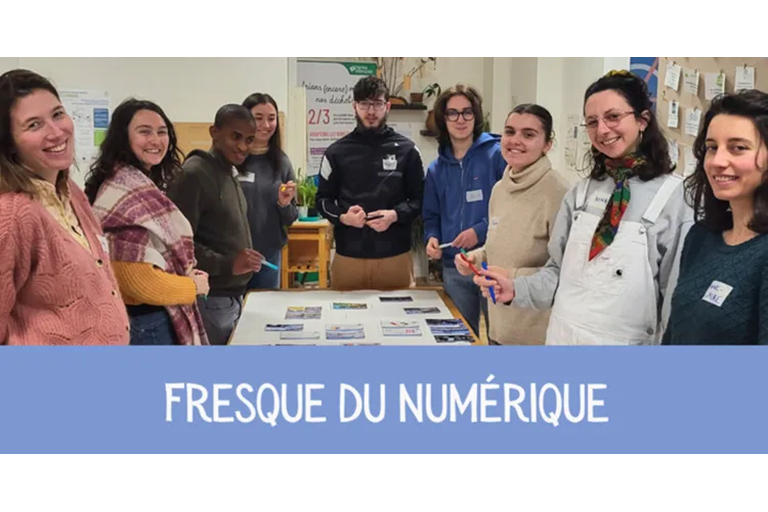 La Fresque du Numérique est un atelier ludique et collaboratif. Le but de ce "serious game" est de sensibiliser et former les participant·es aux enjeux environnementaux du numérique.