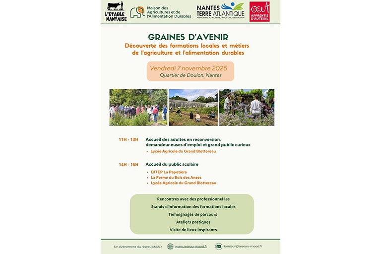 - De 11h à 13h : Accueil des adultes en reconversion, demandeurs et demandeuses d’emploi et grand public au lycée Agricole du Grand-Blottereau