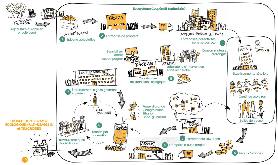 Au fil de l’eau, des acteurs quittent l’aventure, d’autres la rejoignent. Aujourd’hui, à quoi ça ressemble ? La coopérative espagnole livre des oranges à l’épicerie La Coop du Coin. Facility distribue les oranges et récolte les peaux lors des prestations de nettoyage chez les entreprises clientes. L’entreprise L’Avant d’Après a créé une solution low tech pour fabriquer le produit via une macération assez simple. La formulation chimique a été développée par les élèves de l’IUT de Saint-Nazaire. Le produit de nettoyage vise à être fabriqué par une structure d’insertion.