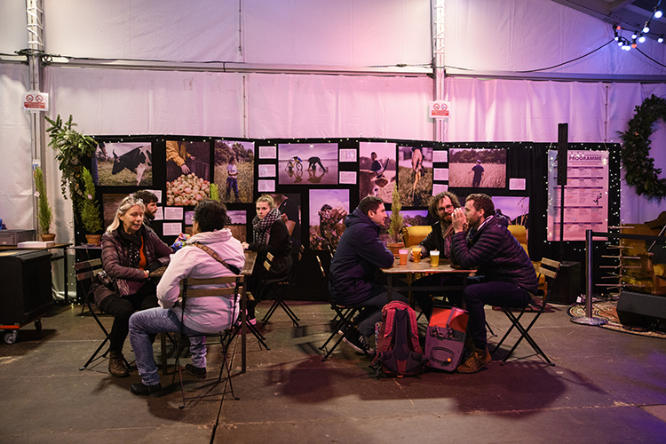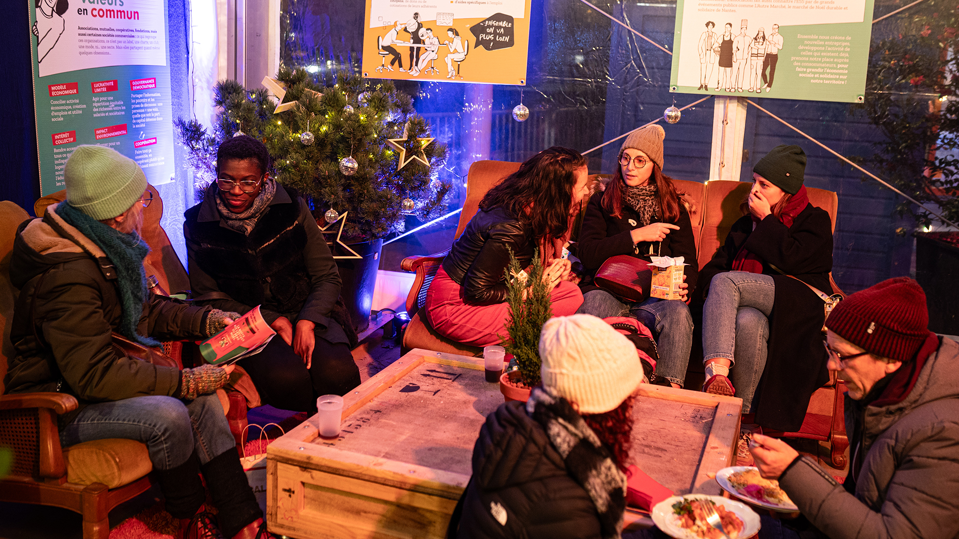 La nuit tombe et les lumières s’allument, il est temps de venir prendre un vin ou un chocolat chaud et de s’installer dans un canapé de la terrasse couverte. Le bar de l’Autre Marché abrite celles et ceux qui veulent flâner, ralentir le pas, en musique et en bonne compagnie.