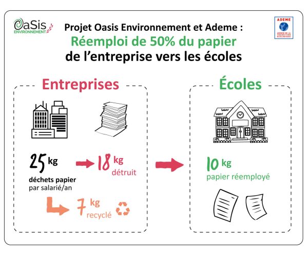 L’association OASIS Environnement en partenariat avec l’ADEME lance une expérimentation, unique en France, de réemploi du papier des entreprises vers les écoles primaires sur Nantes métropole. L’objectif est de doubler la durée de vie du papier.